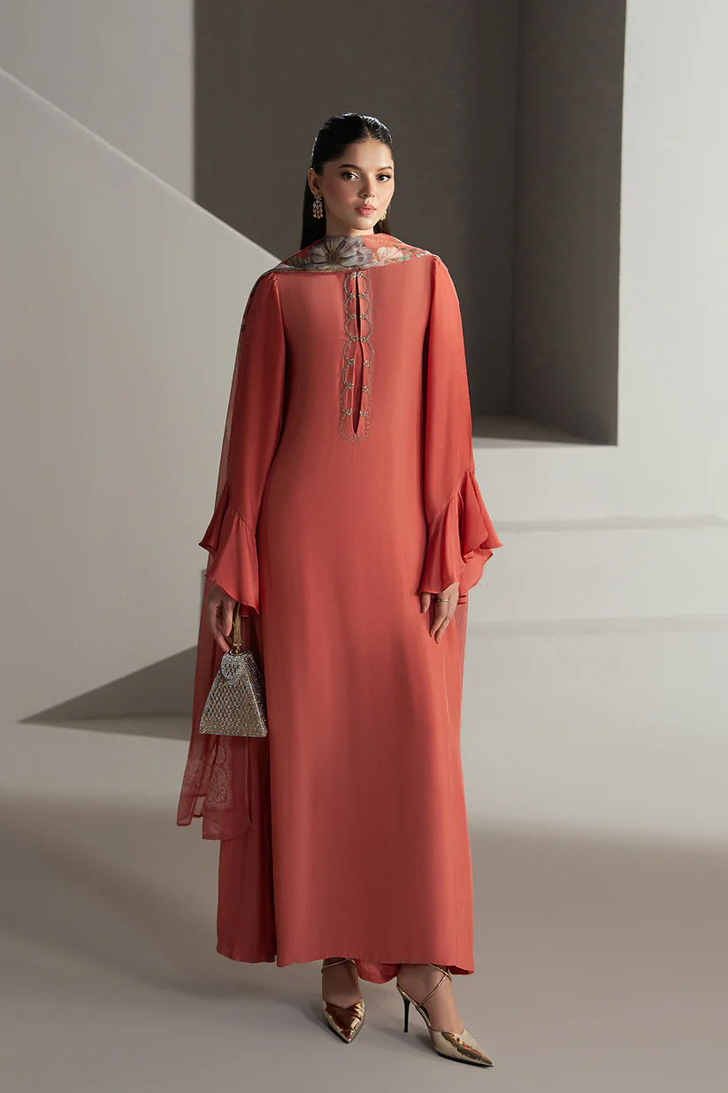 & Free Shipping- This flared Coral medium silk dress stirs up a fluttery summer affair, with ruffled sleeves it flows through the air, delicate and subtle. The neckline is elegantly embellished with scallops to complete the look. Pair it up with “Daesar Dupatta” to complete the look.